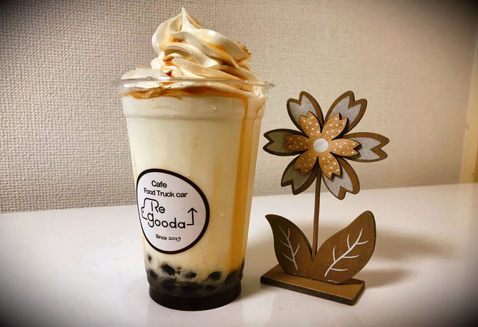 ・Tapioca com chá hojicha e cobertura de creme de leite fresco