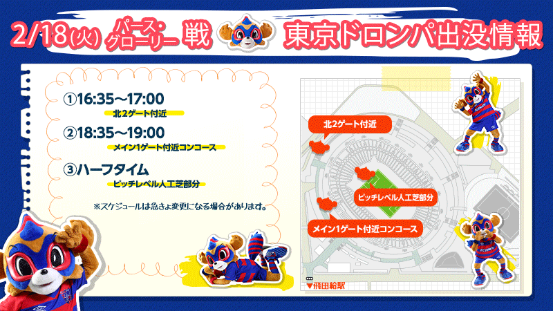 18/2 (Ter) AFC Champions League 2020 Fase de Grupos Jogo 2 vs Perth Glory (Início às 19:00 / Tokyo Stadium) TOKYO DOROMPA aparecerá conforme abaixo. Venha conhecer o "TOKYO DOROMPA"!! Aguarde com expectativa!