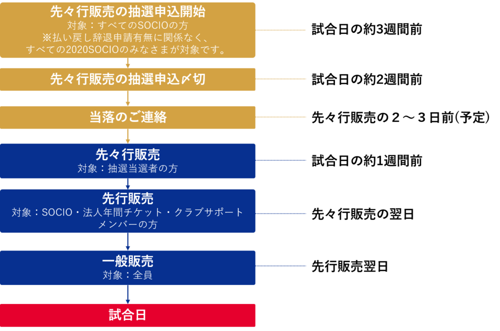 Devido à possibilidade de alterações nas restrições para a realização dos jogos conforme a situação da disseminação da COVID-19, a venda dos ingressos será feita por jogo, com o período de venda começando cerca de 1 semana antes da data da partida. Além disso, a venda inicial para pré-venda antecipada, pré-venda e venda geral começará às 8:00 da manhã.