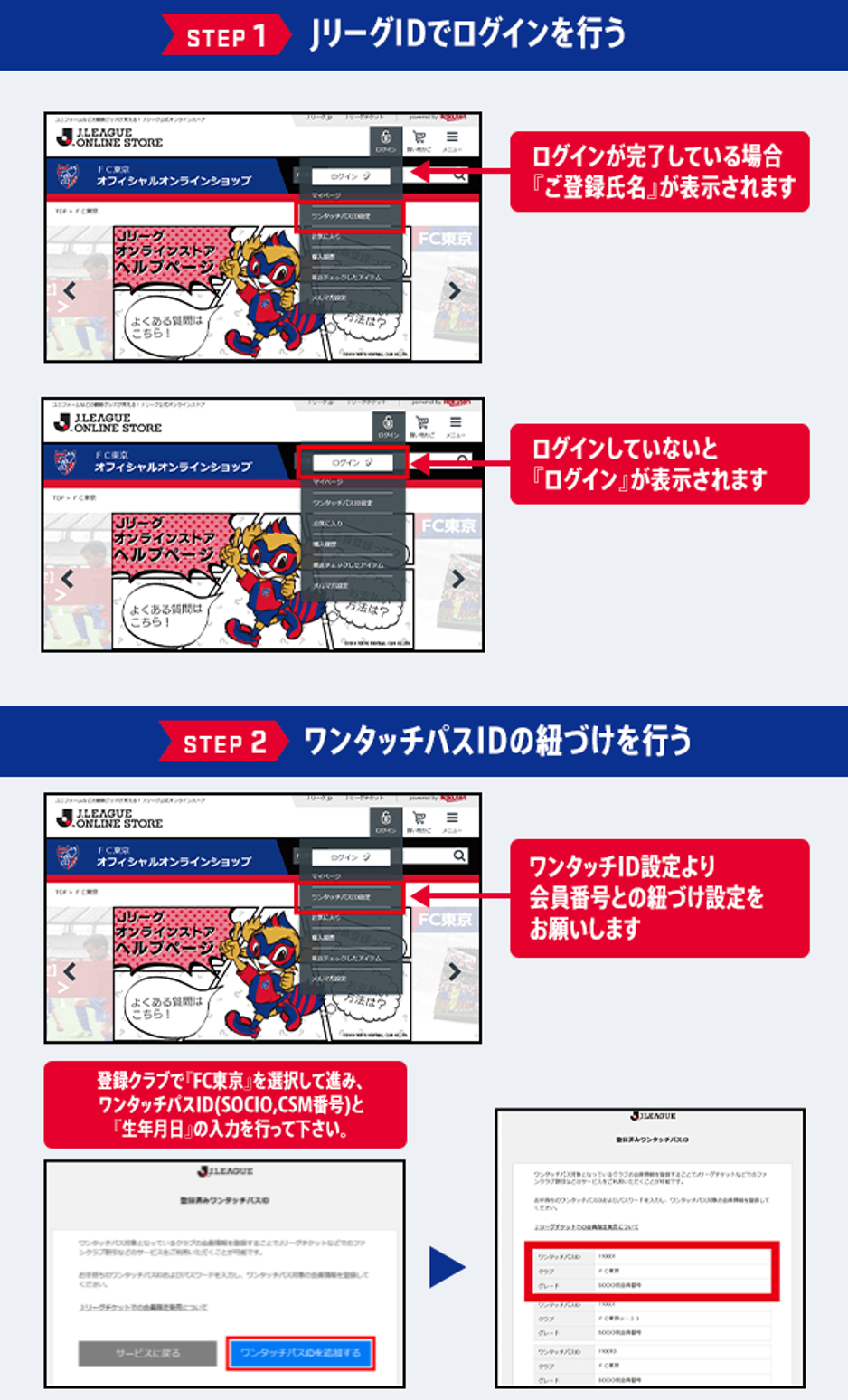 Para comprar com o preço da venda exclusiva para membros, é necessário fazer o "Login com J.League ID" e vincular o "ID One-Touch Pass (número SOCIO/CSM)" na tela da Minha Página da loja oficial online.
