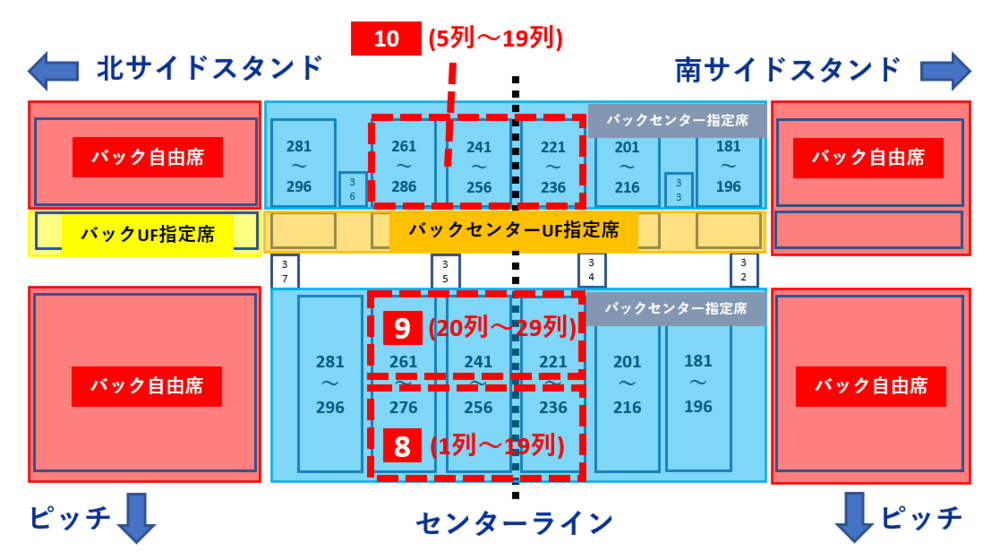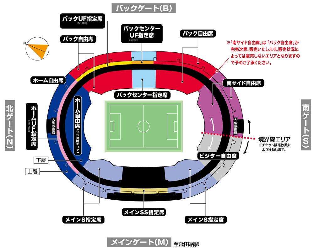 ・Os 3 blocos de assentos reservados SB da arquibancada de trás se expandem para 6 blocos, e os assentos reservados SU da arquibancada de trás ficarão apenas na área norte da parte frontal superior, excluindo os assentos reservados SB.