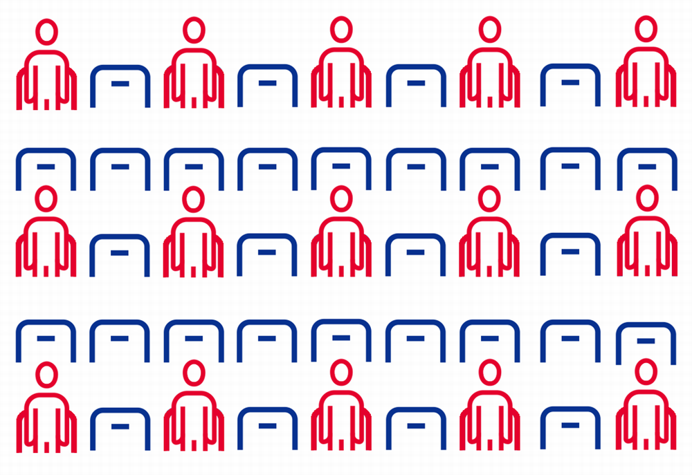 Depois disso, caso as restrições sejam relaxadas, planejamos vender assentos adicionais em um padrão quadriculado, deixando um assento vazio à esquerda e à direita nas fileiras que não estavam sendo vendidas.