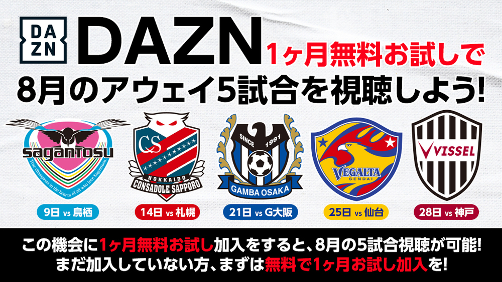 Durante o período de 5 jogos consecutivos fora de casa em agosto, realizaremos o 'Mês de Fortalecimento da Visualização no DAZN!' para que todos possam assistir ainda mais pelo DAZN.