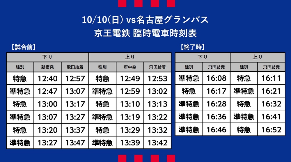 10 de outubro (Dom) 2021 J-League YBC Levain Cup Prime Stage Semifinal Jogo 2 vs Nagoya Grampus (Início às 14:00 / Ajinomoto Stadium) Informações sobre o transporte temporário (trem), ônibus shuttle e ônibus de linha que operarão.