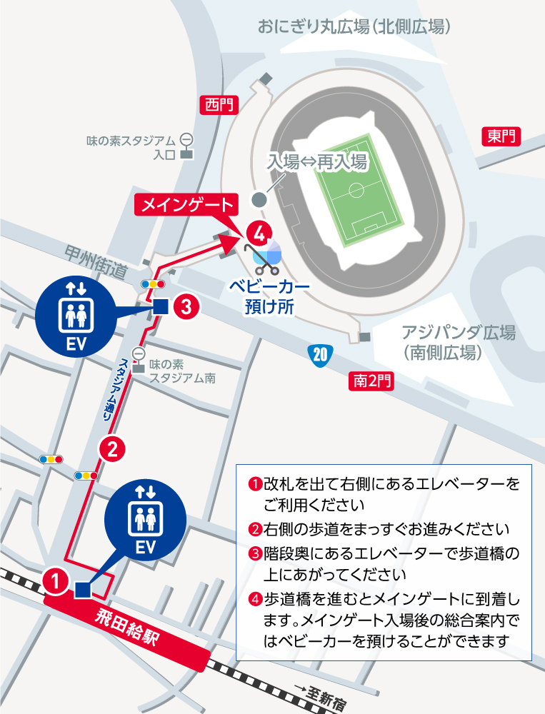 Além disso, após entrar pelo portão principal, você pode deixar o carrinho de bebê no balcão de informações geral do lado da arquibancada principal (ou no portão norte 2 atrás do gol da equipe da casa, ou no local de transferência de latas e garrafas na concourse da arquibancada de trás) e depois ir para a Praça Onigiri Maru.