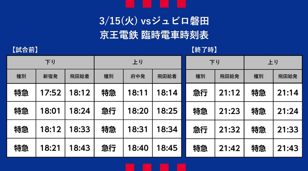 15 de março (Ter) 2022 J-League YBC Levain Cup Rodada 1 vs Júbilo Iwata (Início às 19:00 / Ajinomoto Stadium) Informações sobre o transporte temporário (trem), ônibus shuttle e ônibus de linha disponíveis.