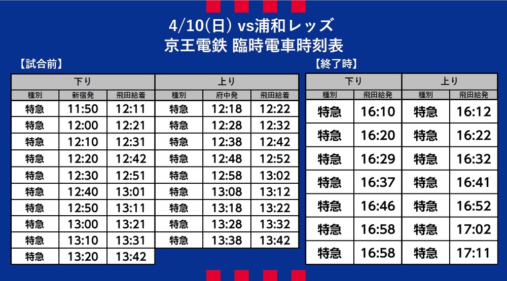 10 de abril (Dom) 2022 Meiji Yasuda Life Insurance Company J1 League Rodada 8 vs Urawa Reds (Início às 14:00 / Ajinomoto Stadium) Informações sobre o transporte temporário (trem), ônibus shuttle e ônibus de linha.