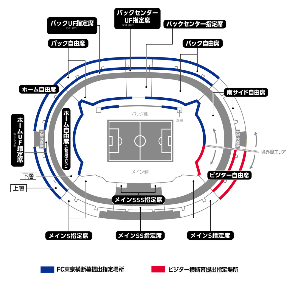 ・Áreas onde é permitido usar bandeiras grandes: arquibancada inferior do setor de torcedores locais e arquibancada inferior do setor de torcedores visitantes