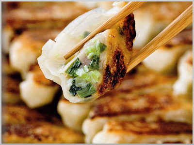 Gyoza jumbo suculento e bolinhos de alho-poró feitos com ingredientes selecionados. Utilizamos carne de porco e repolho nacionais, alho da província de Aomori, alho-poró da província de Tochigi, gengibre da província de Kochi, entre outras carnes e vegetais frescos.