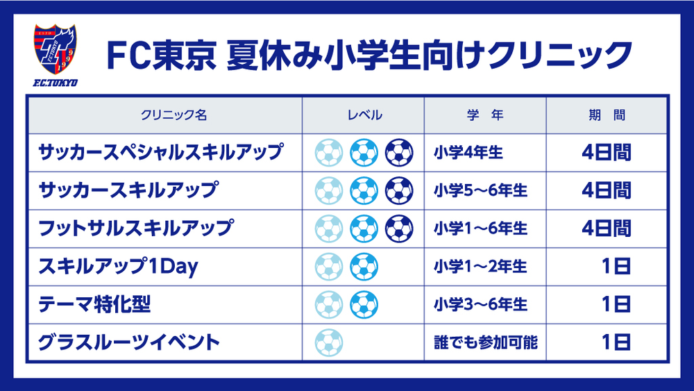 Neste verão, o FC Tokyo realizará diversas clínicas de futebol e futsal para alunos do ensino fundamental de todos os níveis, desde aqueles que querem "começar a jogar futebol neste verão" até aqueles que "já jogam em um nível alto e desejam melhorar ainda mais". Por favor, confira as informações abaixo e esperamos a participação de muitas pessoas nas clínicas que correspondam ao seu nível e necessidades.