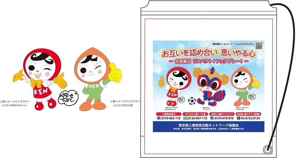Comissários de proteção dos direitos humanos, junto com o personagem de imagem dos direitos humanos do Ministério da Justiça, distribuirão sacolas de lavanderia com design colaborativo com TOKYO DOROMPA e materiais de conscientização sobre direitos humanos.