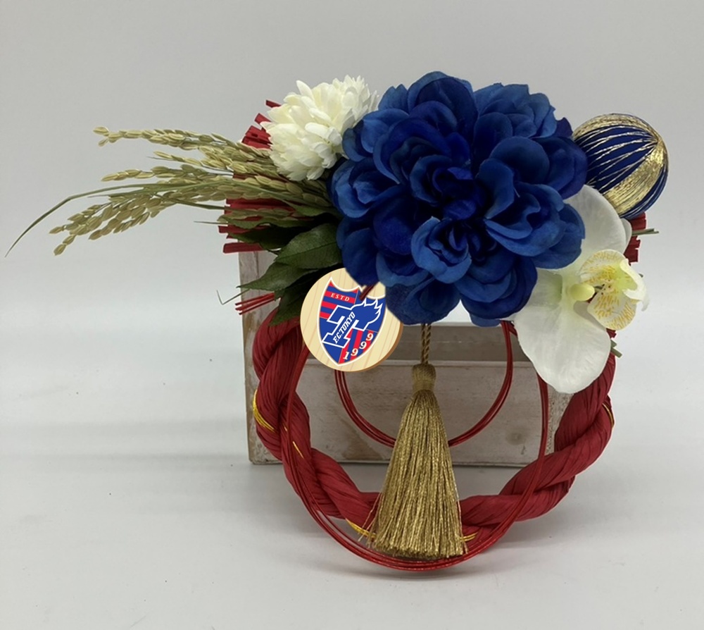 Seguindo o Dia das Mães, decoração de Ano Novo em azul e vermelho produzida pela Hibiya-Kadan Co., Ltd. Também acompanha uma placa de madeira com o emblema do clube.