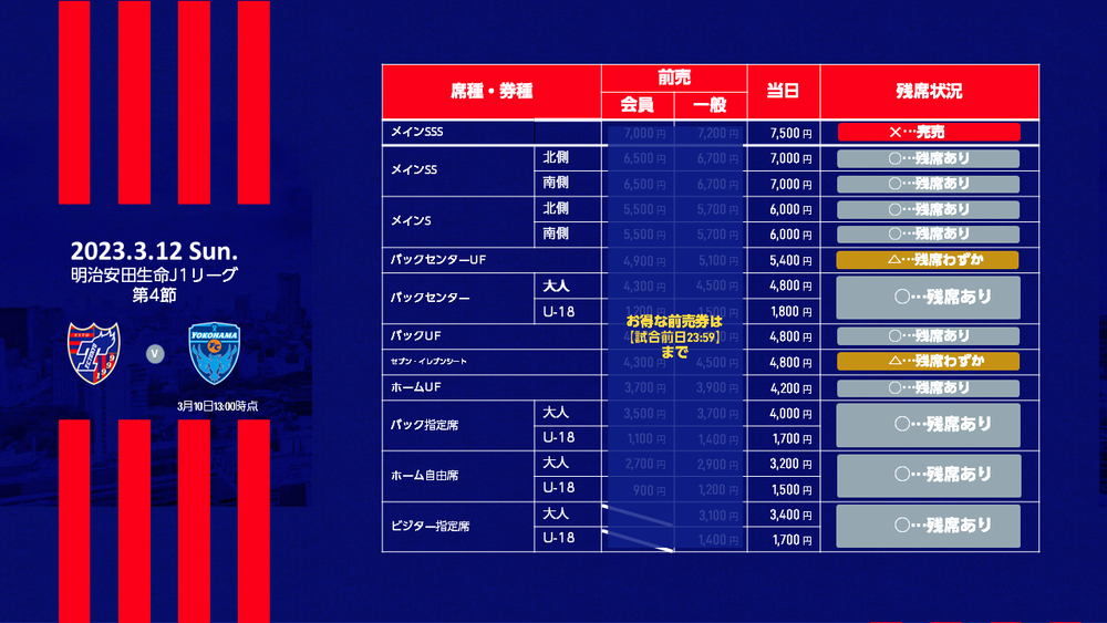 Informamos sobre a venda de ingressos no dia para a 4ª rodada da Liga J1 2023 Meiji Yasuda Life Insurance Company, FC Tokyo vs Yokohama FC (início às 15:00 / Ajinomoto Stadium), conforme abaixo.