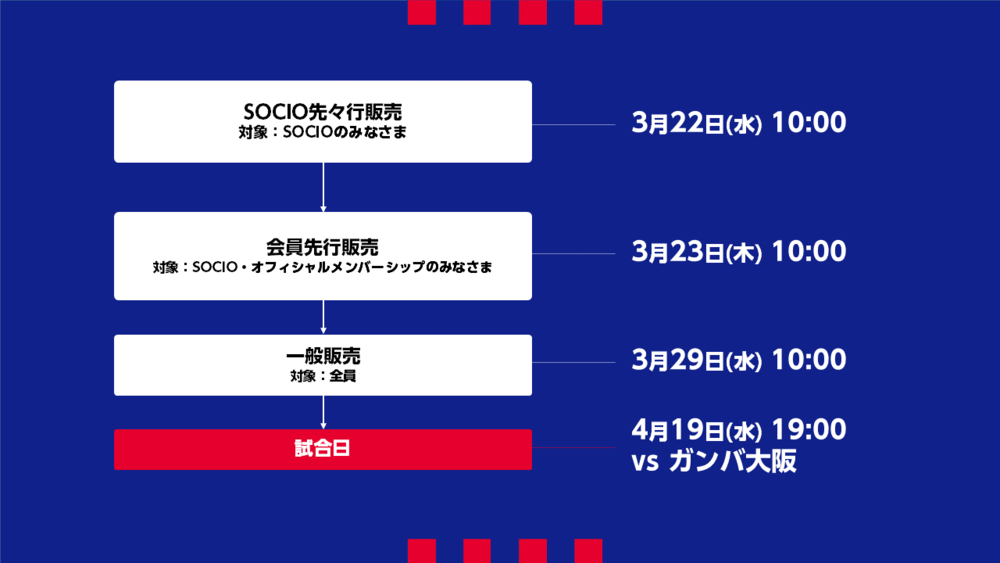 19 de abril (Qua) antes do início do jogo※Pessoas que adquiriram ingressos por transferência de SOCIO não terão entrada prioritária