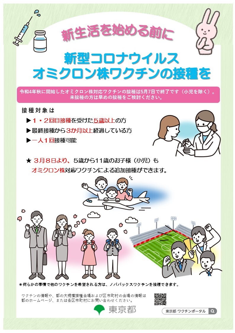 Atualmente, em Tóquio, estamos nos esforçando para promover a vacinação com a vacina adaptada à variante Ômicron, iniciada no outono do ano 4 da era Reiwa. A vacina adaptada à variante Ômicron tem um efeito preventivo contra casos graves superior à vacina tradicional, e espera-se que também seja mais eficaz contra futuras variantes do que a vacina tradicional. Para aqueles que ainda não foram vacinados, por favor, considerem aproveitar esta oportunidade para se vacinar. Além disso, no ano fiscal 5 da era Reiwa, todas as pessoas poderão receber a vacina contra a COVID-19 sem custo próprio.