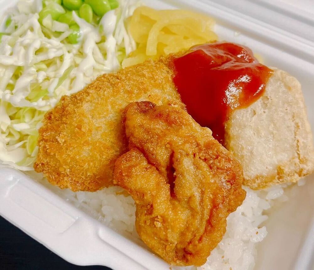 ・Bento de fritura mista (karaage, croquete de cavala, nuggets) 850 ienes