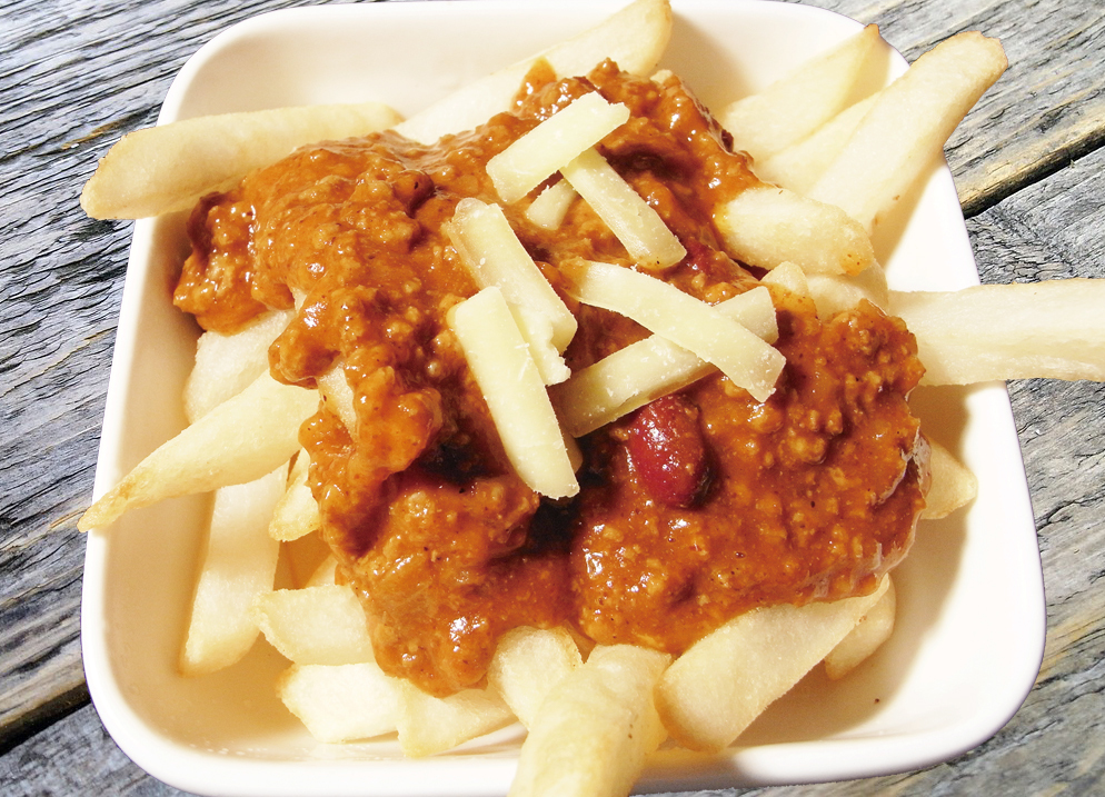 A combinação do chili beans preparado na loja com batatas é excelente! Também é perfeito como petisco para cerveja.