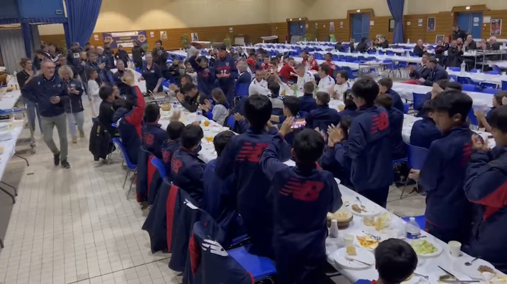 Depois, ao nos dirigirmos para o local da refeição e enquanto jantávamos, uma canção de aniversário (versão em francês) começou a tocar, e comemoramos os aniversariantes próximos Louis ONONUJU, Hisato MATSUMOTO e Shuntaro SANO. Jogadores e membros da equipe de outros times também comemoraram junto, e os três pareciam muito felizes.