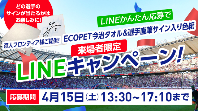 Aviso da campanha exclusiva para visitantes no LINE, onde você pode ganhar uma toalha ECOPET Imabari fornecida pela TEIJIN FRONTIER Co., Ltd. e um papel colorido autografado pelos jogadores