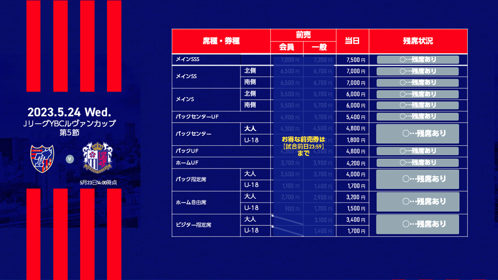 2023 J-League YBC Levain Cup Fase de Grupos Rodada 5 FC Tokyo vs Cerezo Osaka (Início às 19:00 / Ajinomoto Stadium) sobre a venda de ingressos no dia do jogo, informamos conforme abaixo.