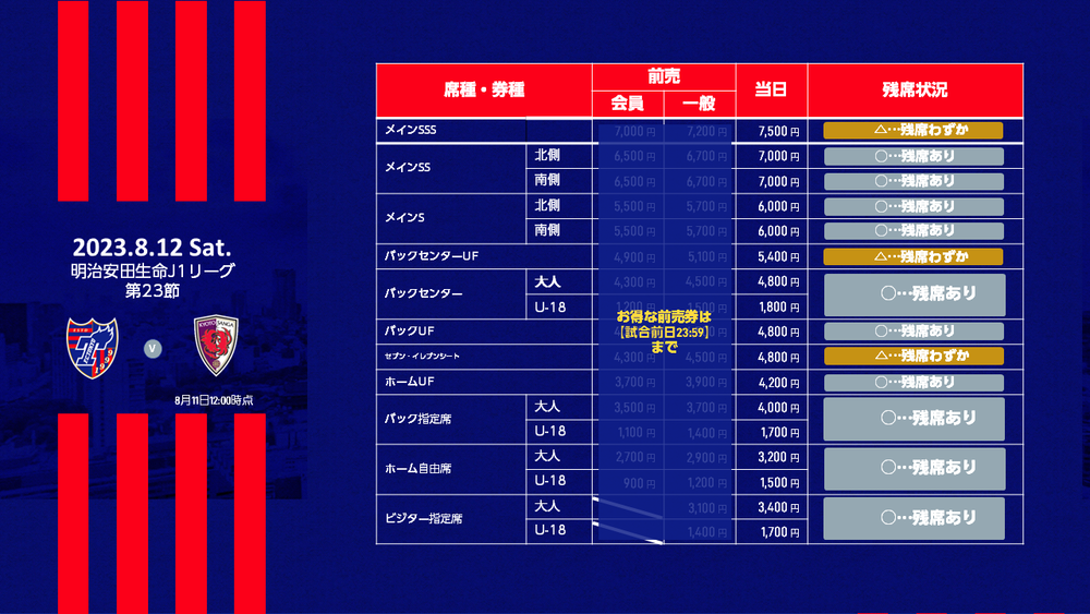 Venda de ingressos no dia para a 23ª rodada da Liga J1 2023 Meiji Yasuda Life Insurance Company FC Tokyo vs Kyoto SANGA F.C. (início às 19:00 / Ajinomoto Stadium) será conforme informado abaixo.