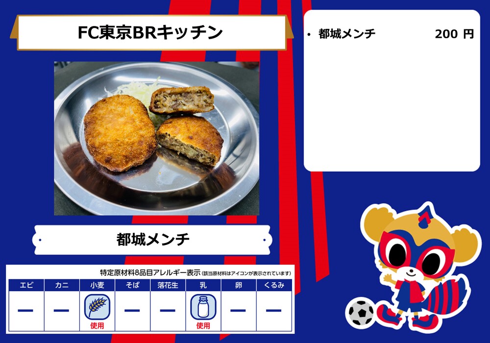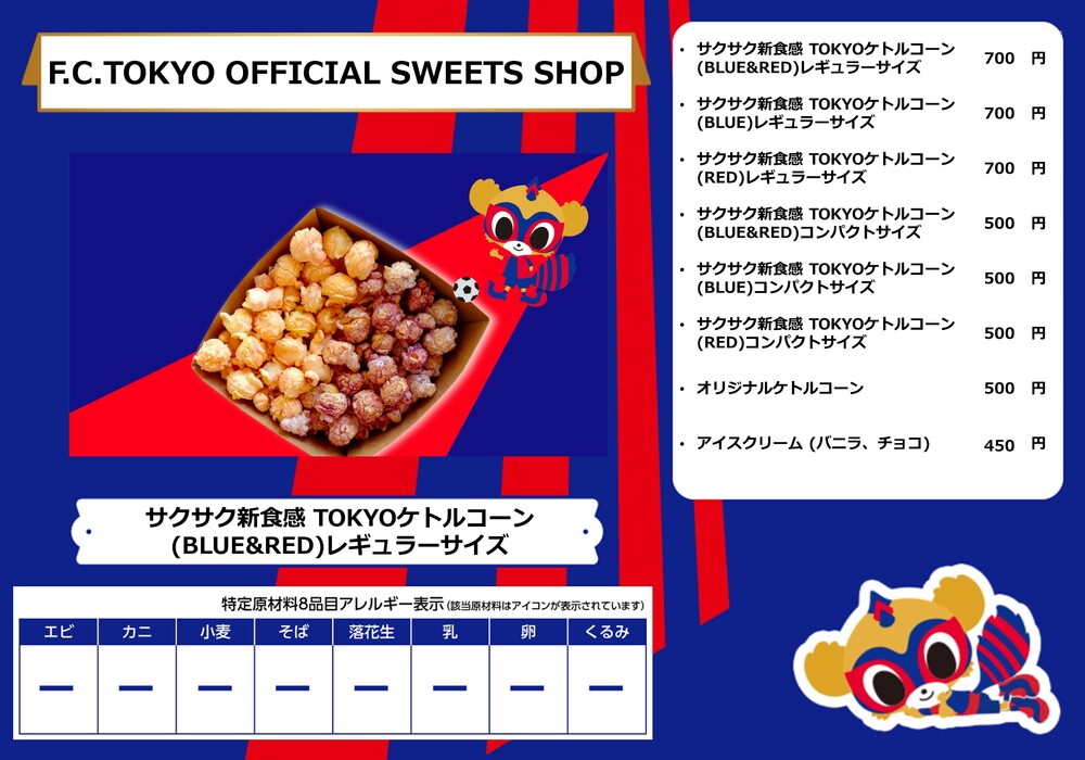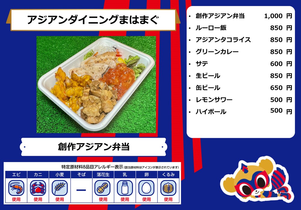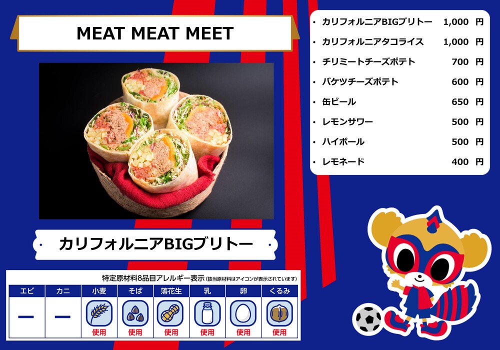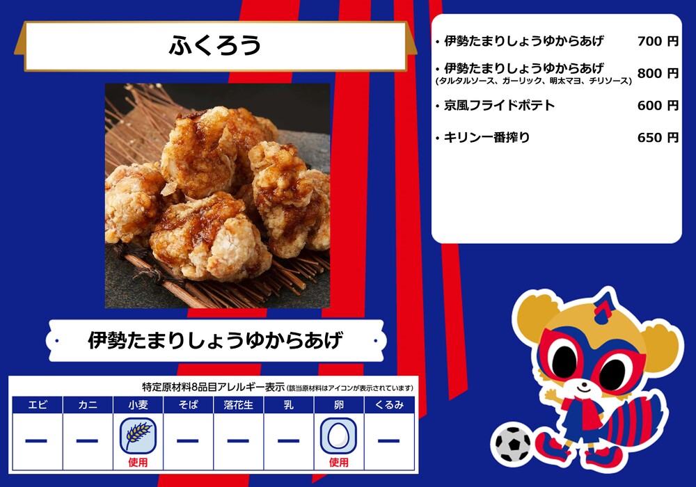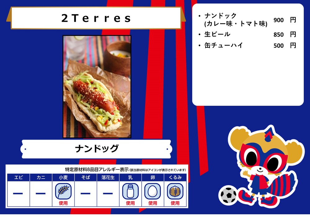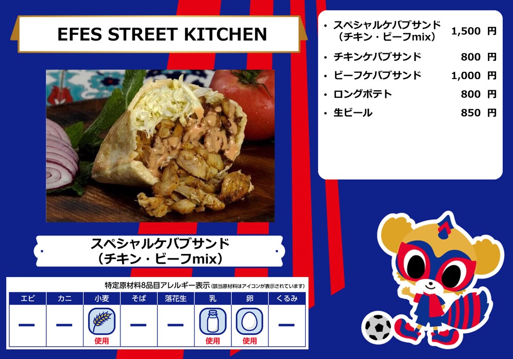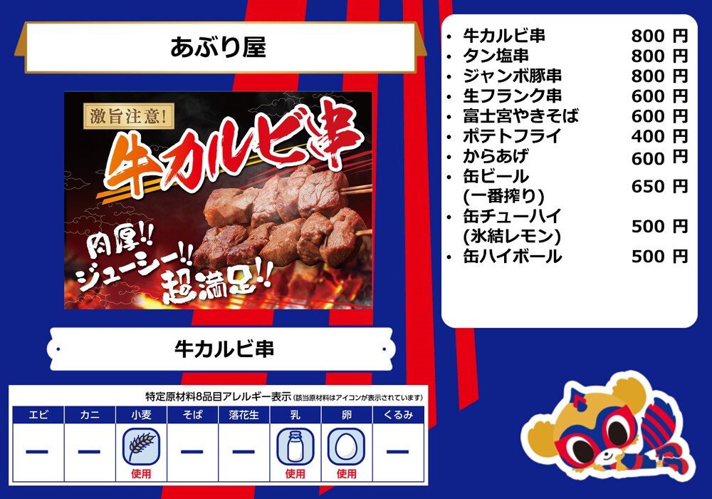 Menu de alimentos que será vendido na AO-AKA STREET e AO-AKA PARK supported by TOKYO GAS (fora do estádio), e nas lojas no corredor interno do estádio no dia 28 de outubro (Sáb) durante o jogo contra Sanfrecce Hiroshima.