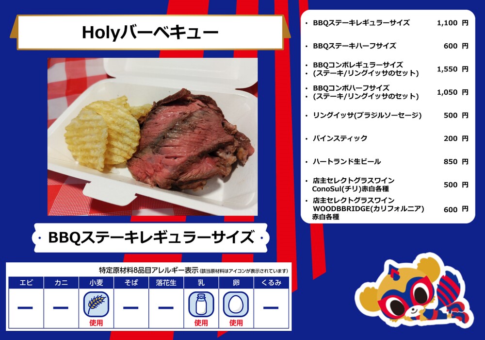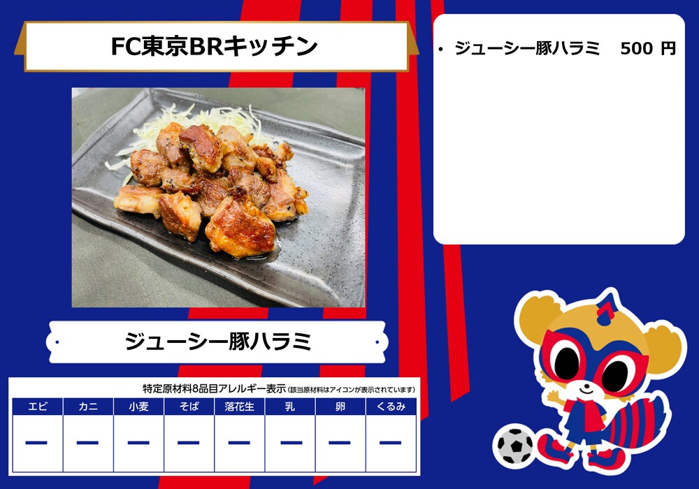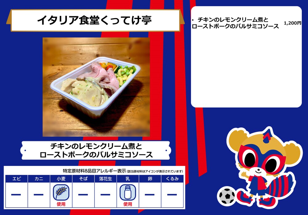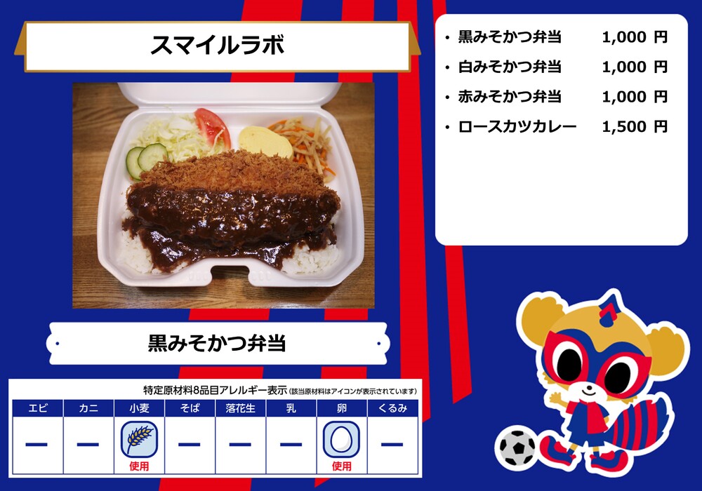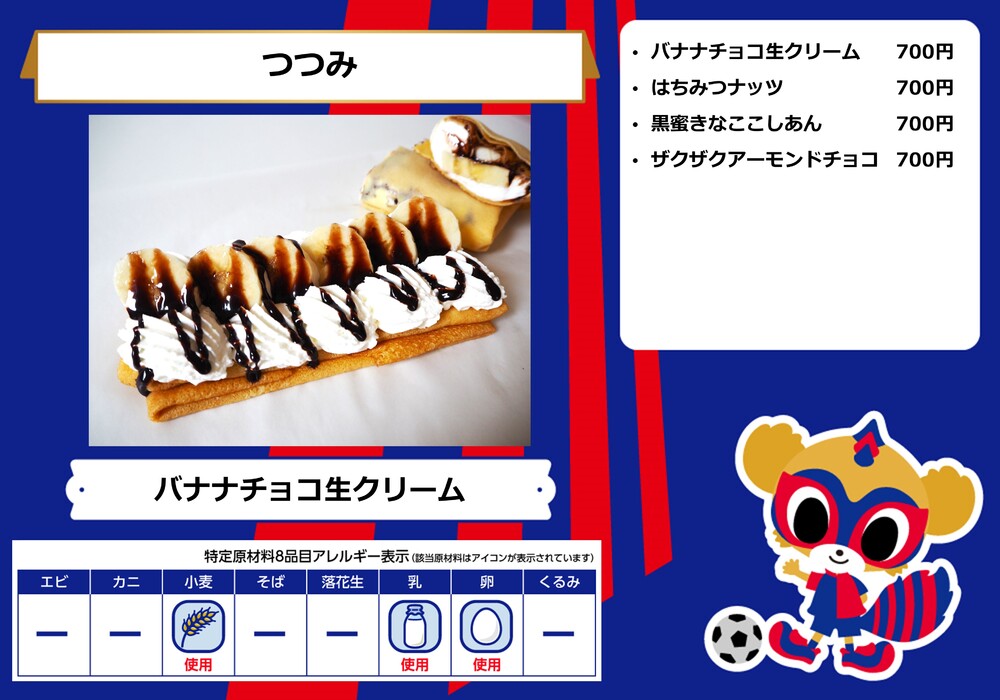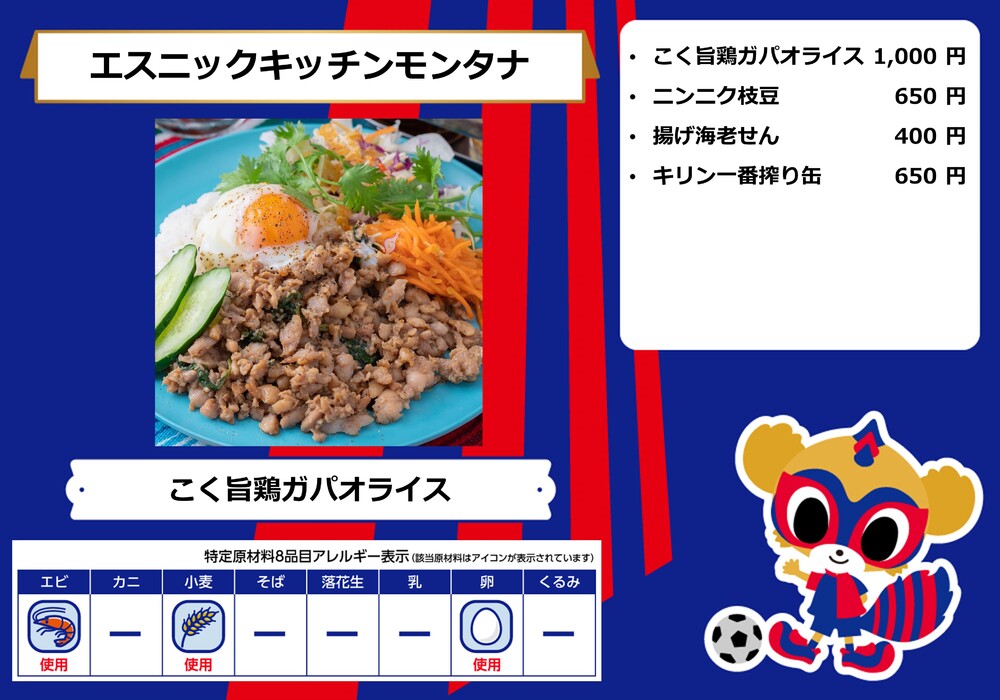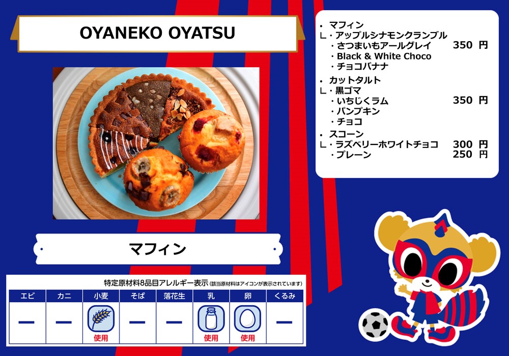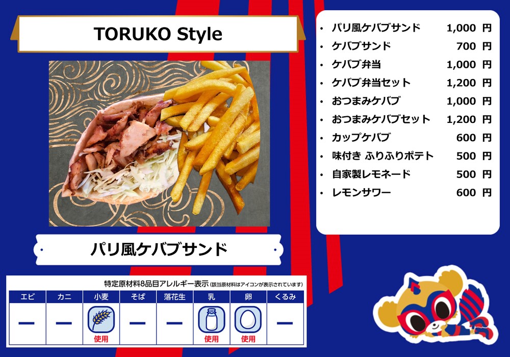 Menu de alimentos que será vendido na AO-AKA STREET e AO-AKA PARK supported by TOKYO GAS (fora do estádio), e nas lojas no corredor interno do estádio no dia 28 de outubro (Sáb) durante o jogo contra Sanfrecce Hiroshima.