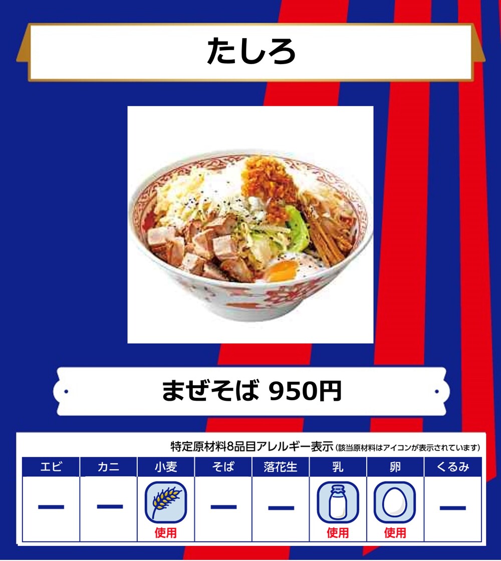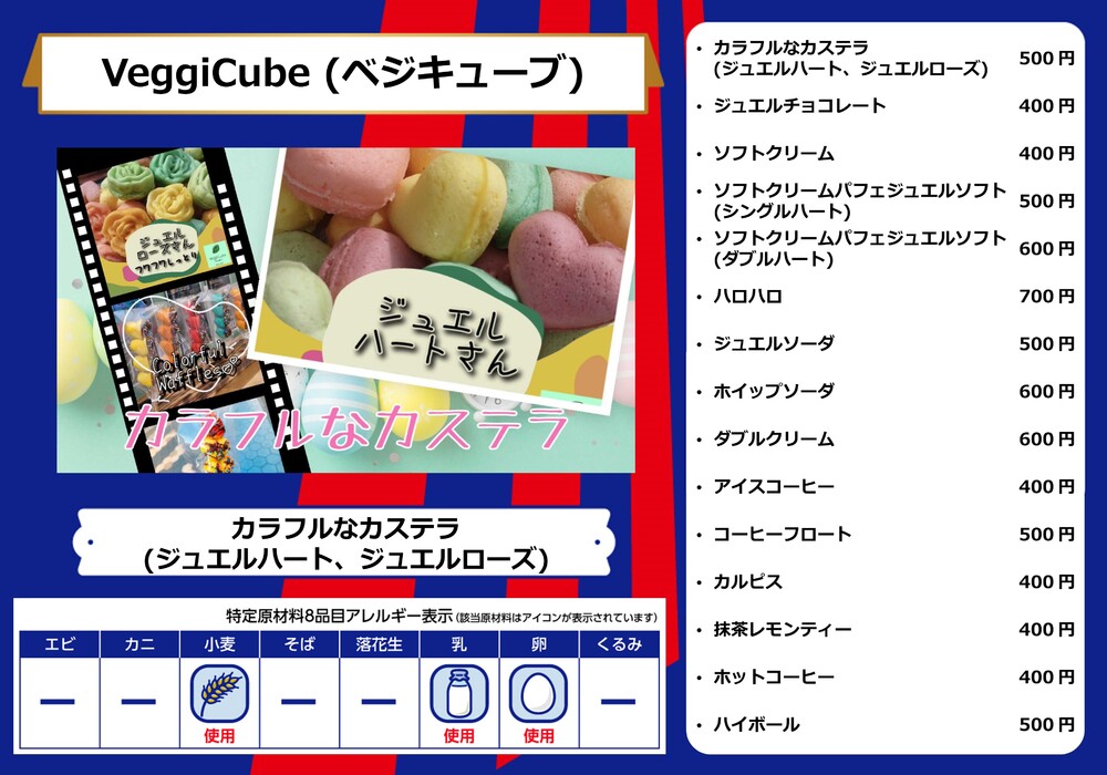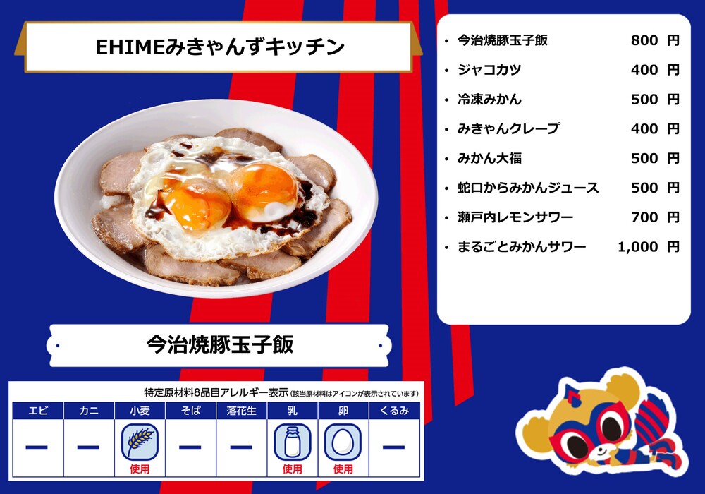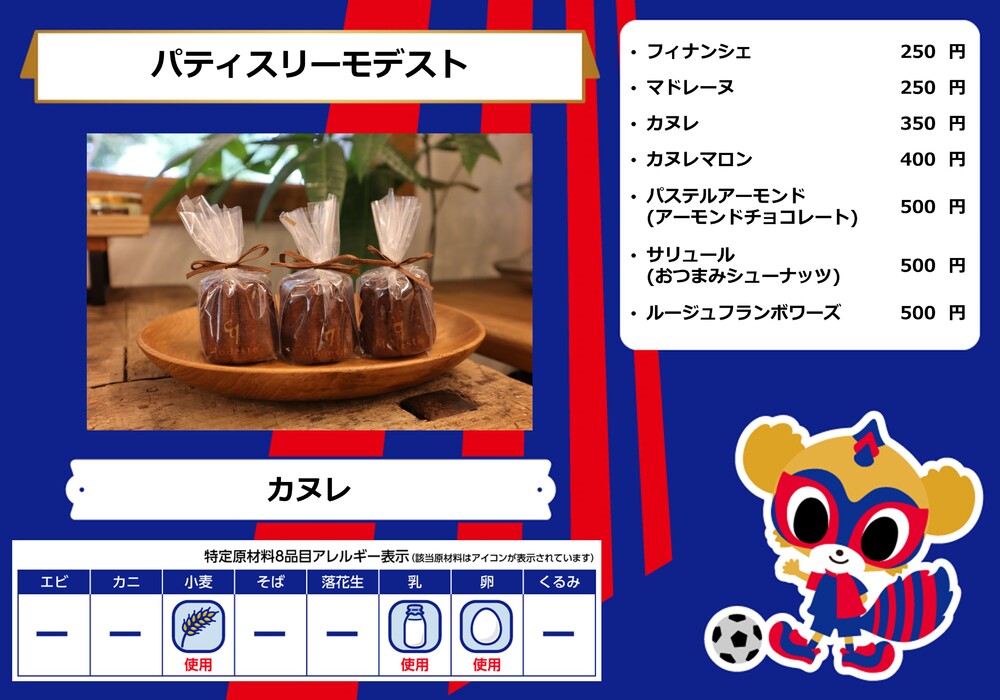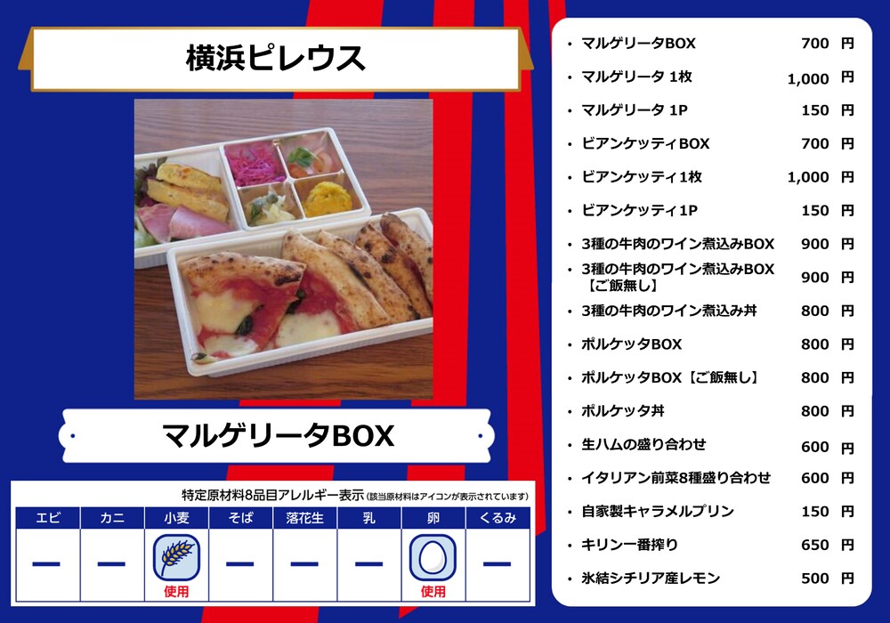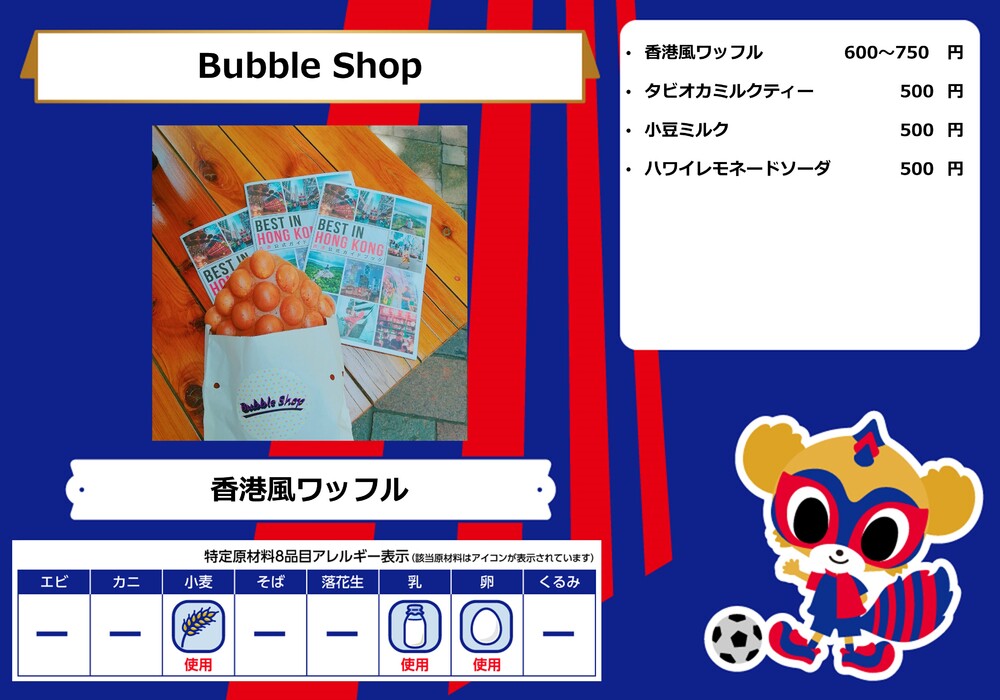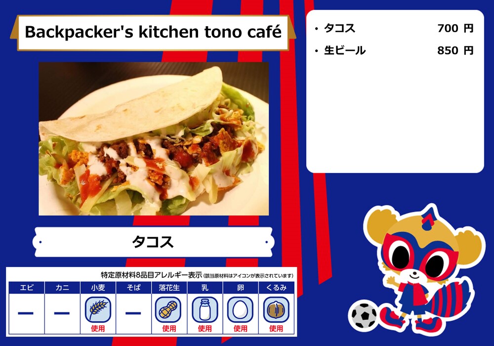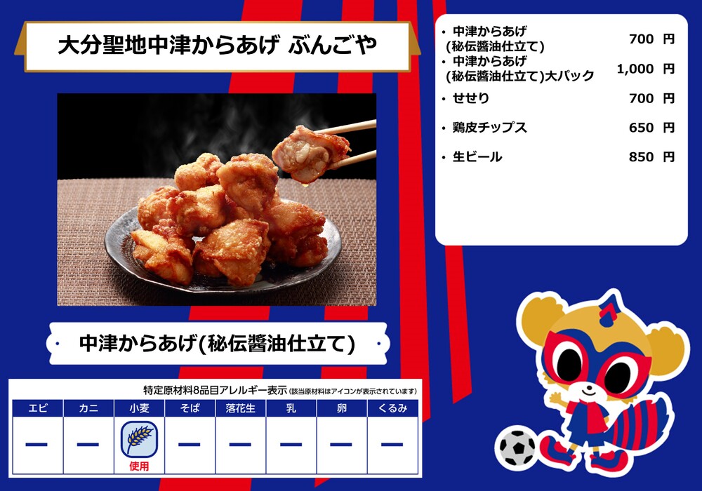 Menu de alimentos que será vendido na AO-AKA STREET e AO-AKA PARK supported by TOKYO GAS (fora do estádio), e nas lojas no corredor interno do estádio no dia 28 de outubro (Sáb) durante o jogo contra Sanfrecce Hiroshima.