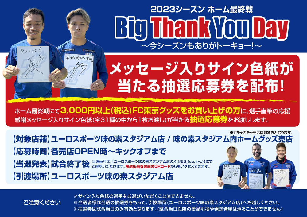No dia do evento, para quem comprar produtos do FC Tokyo no valor de 3.000 ienes ou mais (com impostos incluídos), será realizado um sorteio para ganhar um cartão autografado com uma mensagem de agradecimento escrita à mão pelos jogadores.