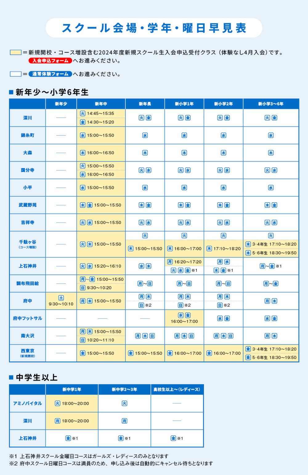 ・Os cursos de domingo das escolas Chofu Tobitakyu, Fuchu e Minami Osawa são configurados para turmas até o 2º ano do ensino fundamental, portanto, ao passar para o 3º ano do ensino fundamental, será necessário mudar para outro curso ou outra unidade da escola. Caso não haja vaga disponível no local desejado, será necessário entrar na lista de espera.
