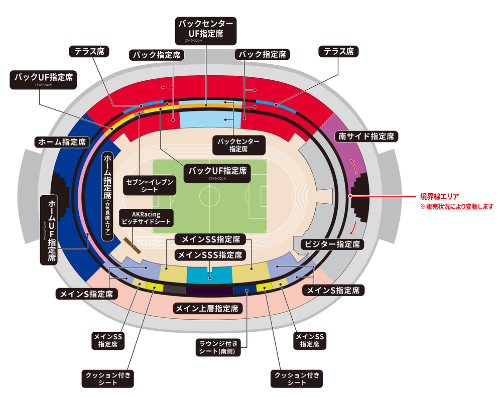 ※Os tipos de assentos onde é permitido usar uniformes e produtos da equipe visitante e torcer pela equipe visitante são os três mencionados acima: "Assentos designados Main SS lado sul", "Assentos designados Main S lado sul", "Assentos com almofadas lado sul" e "Assentos designados para visitantes". Todos os outros tipos de assentos são para torcedores do FC Tokyo.