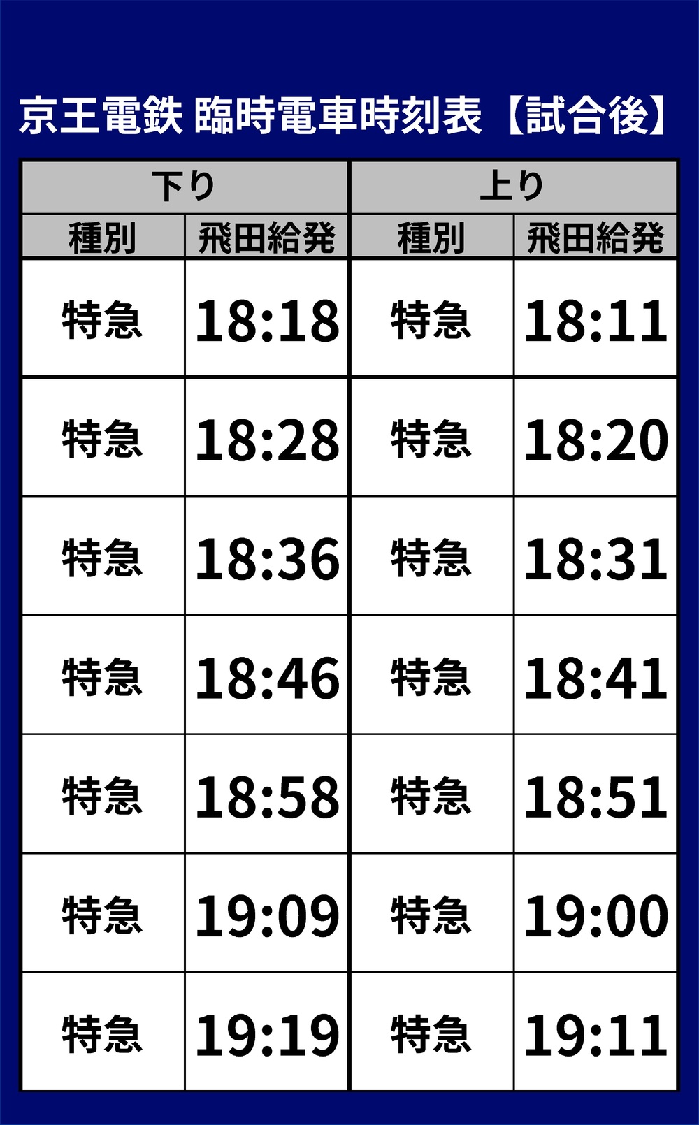 Sentido descente… 7 trens expressos das 18:18 às 19:19 partindo de Tobitakyu