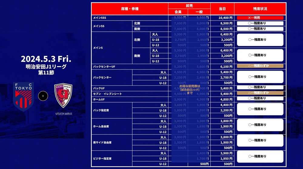 Informamos sobre a venda de ingressos no dia para a 11ª rodada da Liga Meiji Yasuda J1 2024, FC Tokyo vs Kyoto Sanga F.C. (início às 15:00 / Ajinomoto Stadium), conforme abaixo.
