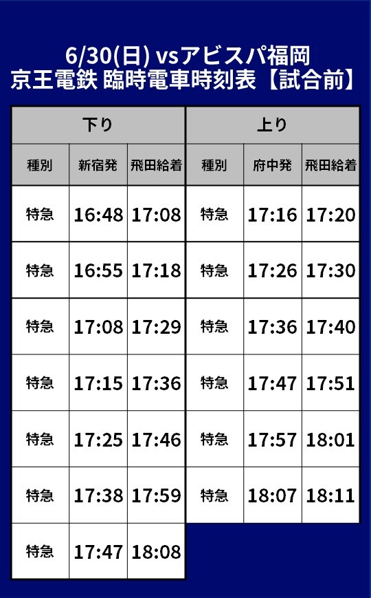 30 de junho (Dom) 2024 Meiji Yasuda J1 League Rodada 21 vs Avispa Fukuoka (Início às 18:30 / Ajinomoto Stadium) Informações sobre o transporte temporário (trem), ônibus shuttle e ônibus de linha que serão operados.