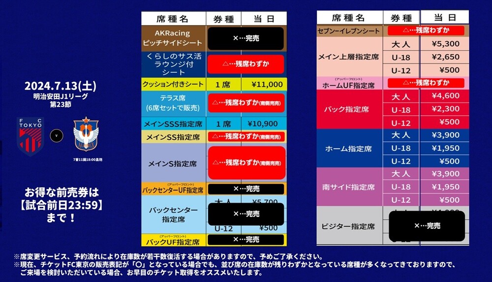 Informamos sobre a venda de ingressos no dia para a 23ª rodada da Liga Meiji Yasuda J1 2024, FC Tokyo vs Albirex Niigata (início às 19:00 / Japan National Stadium), conforme abaixo.