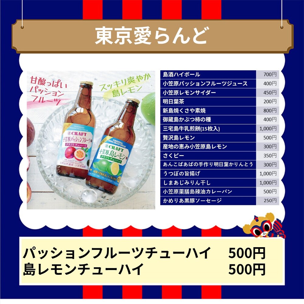 Para transmitir o charme das Ilhas Izu e das Ilhas Ogasawara, venderemos produtos locais, como saquê das ilhas e salsichas de porco preto Camellia.
