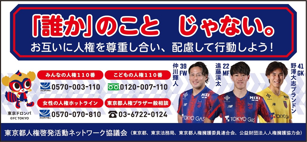 5 de outubro (Sáb) de 2024 Meiji Yasuda J1 League Rodada 33 vs Sagan Tosu (Início às 15:00 / Ajinomoto Stadium) realizaremos a divulgação das "Atividades de Conscientização sobre Direitos Humanos" em colaboração com a Rede de Atividades de Conscientização sobre Direitos Humanos de Tóquio (Governo Metropolitano de Tóquio, Escritório Jurídico de Tóquio, Federação dos Comissários de Proteção dos Direitos Humanos de Tóquio, Fundação Pública para Cooperação na Proteção dos Direitos Humanos).