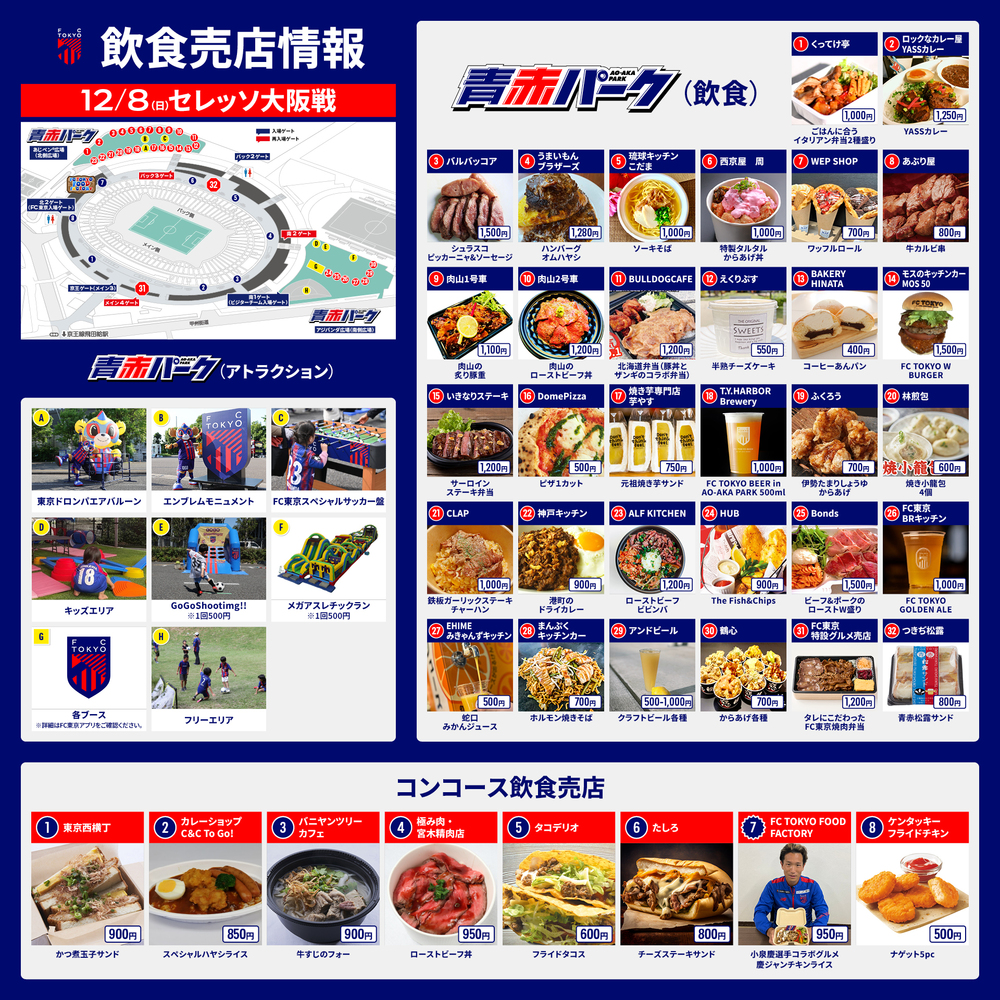 Informamos sobre as opções de alimentos e bebidas que serão vendidas no AO-AKA STREET, AO-AKA PARK (fora do estádio) e nas lojas no corredor interno do estádio durante o jogo contra o Cerezo Osaka em 8 de dezembro (Dom).
