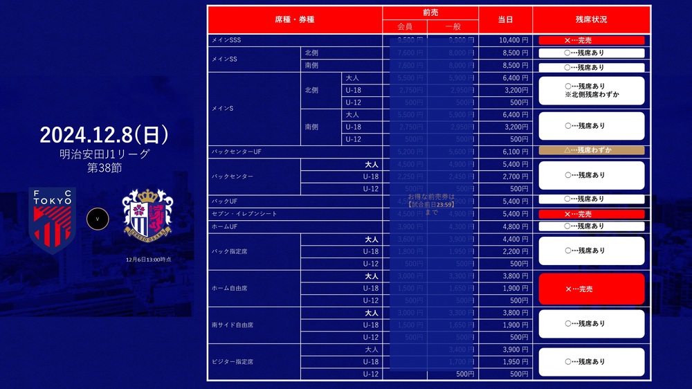 Venda de ingressos no dia para a 38ª rodada da J1 League Meiji Yasuda 2024 FC Tokyo vs Cerezo Osaka (início às 14:00 / Ajinomoto Stadium), conforme informado abaixo.