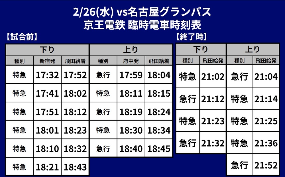 26 de fevereiro (Qua) 2025 Meiji Yasuda J1 League Rodada 3 vs Nagoya Grampus (Início às 19:00 / Ajinomoto Stadium) Informações sobre o transporte temporário (ferroviário), ônibus shuttle e ônibus de linha que serão operados.