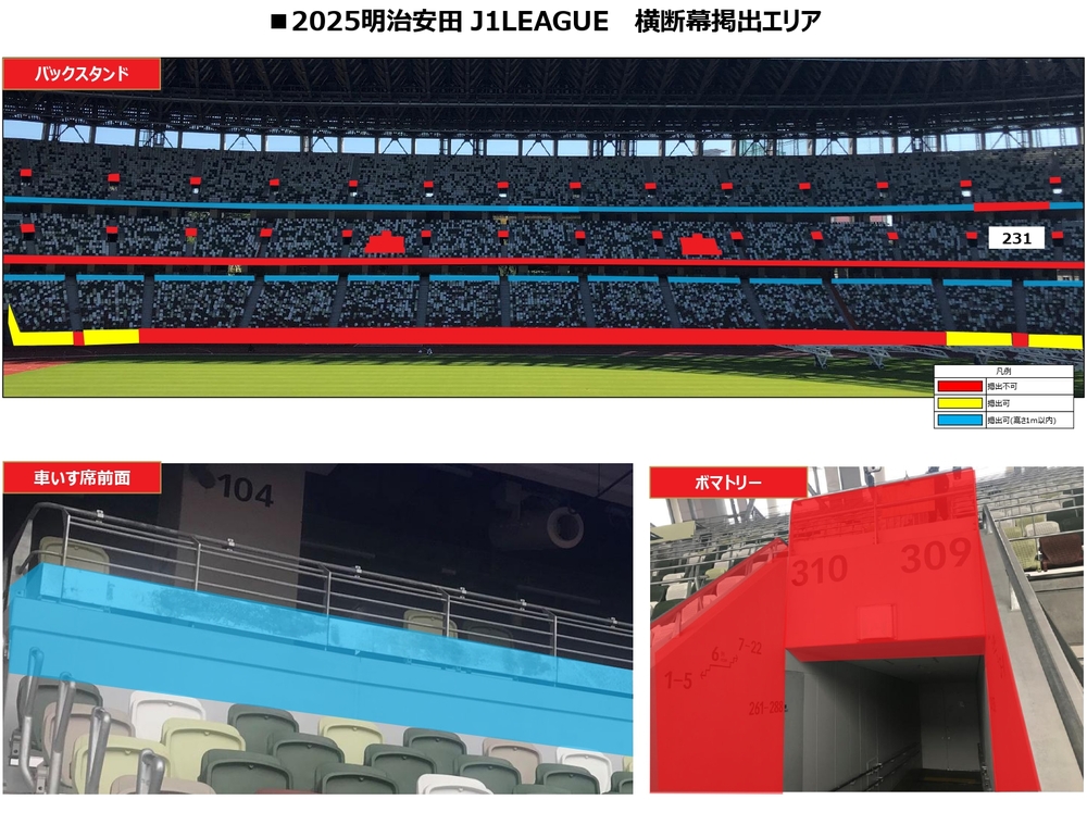 ※Ao usar bandeiras grandes, pedimos que tenha bastante cuidado com os outros espectadores ao redor. Os organizadores podem proibir a entrada e o uso caso julguem que o conteúdo seja difamatório, calunioso, racista, com fins publicitários, contrário à ordem pública e bons costumes, ou de qualquer outra forma inadequado para o local da partida.