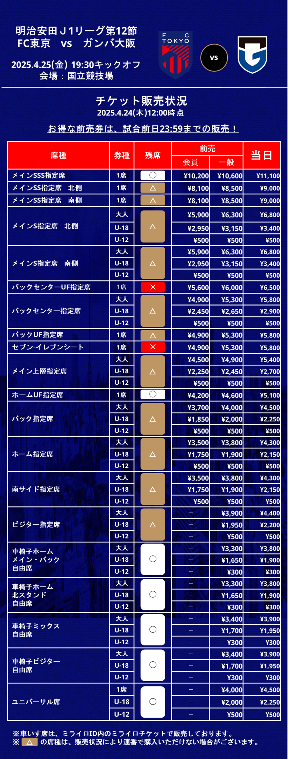 Informamos sobre a venda de ingressos no dia para a 12ª rodada da Liga Meiji Yasuda J1 2025, FC Tokyo vs Gamba Osaka (início às 19:30 no Ajinomoto Stadium), conforme abaixo.
