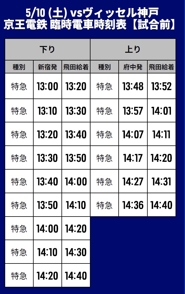 10 de maio (Sáb) 2025 Meiji Yasuda J1 League Rodada 16 vs Vissel Kobe (Início às 15:00 / Ajinomoto Stadium) informações sobre o transporte temporário (trem), ônibus shuttle e ônibus de linha serão fornecidas.