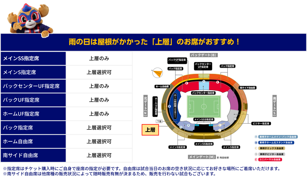 ※Dependendo da parte frontal, direção do vento e intensidade da chuva, pode haver infiltração de água, portanto, prepare capa de chuva ou outros equipamentos impermeáveis conforme necessário antes de assistir ao jogo.