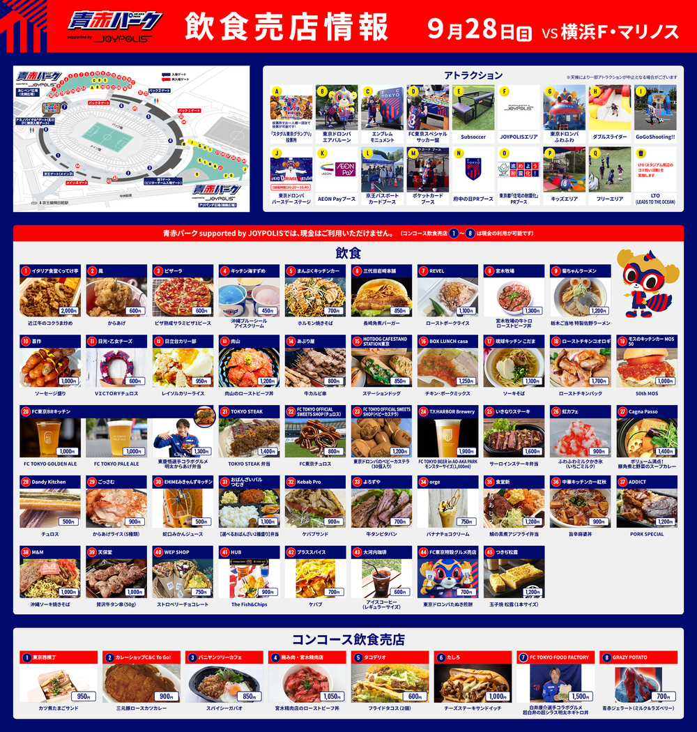 28 de setembro (Dom) 2025 Meiji Yasuda J1 League Rodada 32 vs Yokohama F. Marinos (kickoff às 18:00 / Ajinomoto Stadium), AO-AKA PARK supported by JOYPOLIS (fora do estádio), em visita!! Informamos as informações sobre alimentos e bebidas que serão vendidos no AO-AKA PARK supported by JOYPOLIS e nas lojas dentro do concourse do estádio (dentro do estádio).