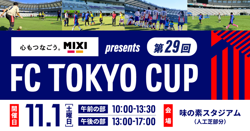 Para os adultos que têm dificuldade em garantir um local para desfrutar do futebol no dia a dia, realizamos a FC TOKYO CUP, que tem como objetivo aprofundar a interação além das barreiras de indústria, idade e gênero, com o patrocínio da MIXI, Inc., uma empresa que desenvolve seus negócios com o princípio de 【Criar espaços e oportunidades que conectam corações】.
