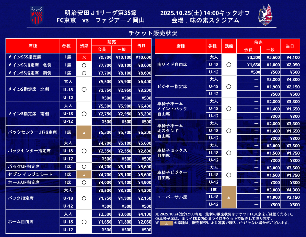 Informamos sobre a venda de ingressos no dia para a 35ª rodada da J1 League Meiji Yasuda 2025, FC Tokyo vs Fagiano Okayama (início às 14:00 / Ajinomoto Stadium), conforme abaixo.