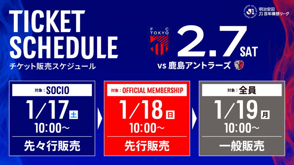 7 de fevereiro (Sáb) Meiji Yasuda J1 Century Vision League Rodada 1 vs Kashima Antlers (Início às 13:30 / Ajinomoto Stadium) informações sobre a venda de ingressos.