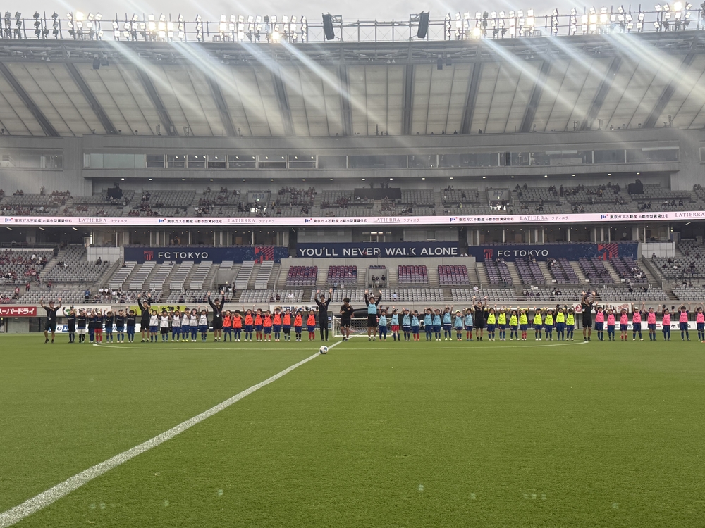 Quando um gol é marcado, os aplausos ecoam, e os alunos da escola podem ser vistos jogando ativamente enquanto experimentam a atmosfera única do Ajinomoto Stadium.