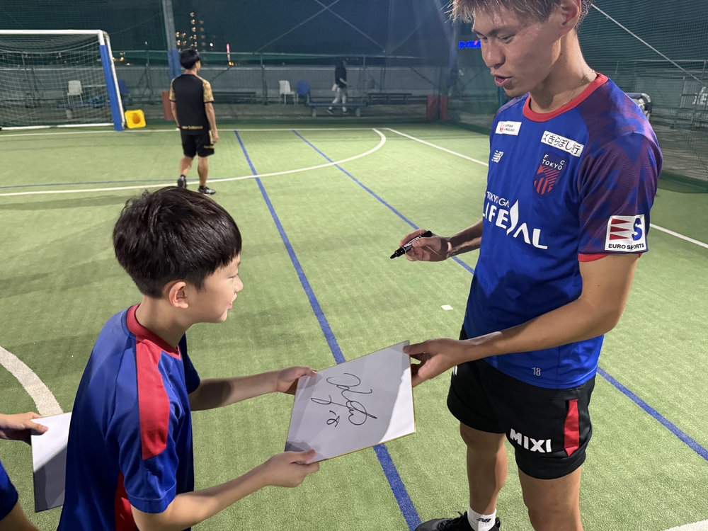 Depois disso, cada um assinou nos papéis coloridos, bolsas e no uniforme do jogador Hashimoto, e entregamos o "Guts Gear" fornecido pela AJINOMOTO CO., INC.!